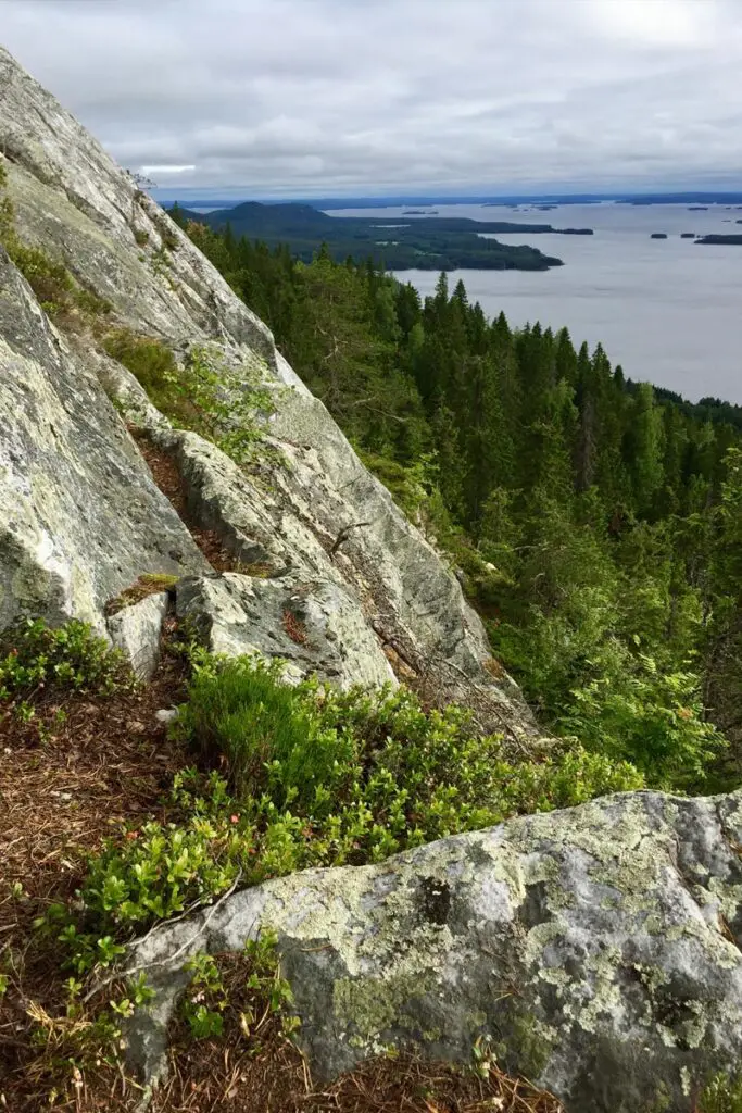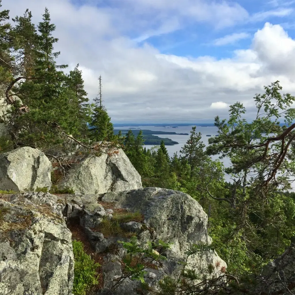 Ukko-Kolin huipulla suomalaisen luonnon peruselementit – harmaa peruskallio, vihreä havumetsä, järvi täynnä saaria ja sininen taivas – ovat täydellisessä tasapainossa.